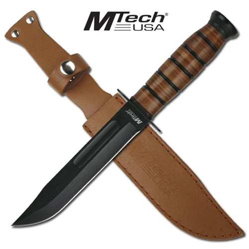 12″ Overall Length Mtech Fixed Blade Knife. 6.5″ Black 440 Stainless Steel Blade with Wood Handle. Includes Leather Sheath