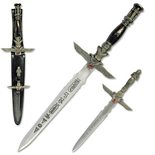 18.5″ & 10″ Overall Length 2 Piece Fantasy Mummy Short Sword. Blade With Egyptian Character Etching. Black Egyptian Design Handle. Includes Sheath