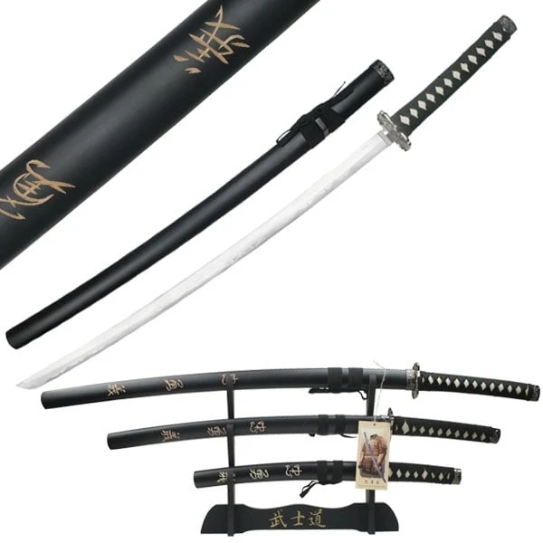 40″ Overall Length Katana part of 3 Piece Samurai Sword Set. Stainless Steel Blade. Black Cord Wrapped Handle. Engraved Bushido Code on Scabbard. Includes Stand