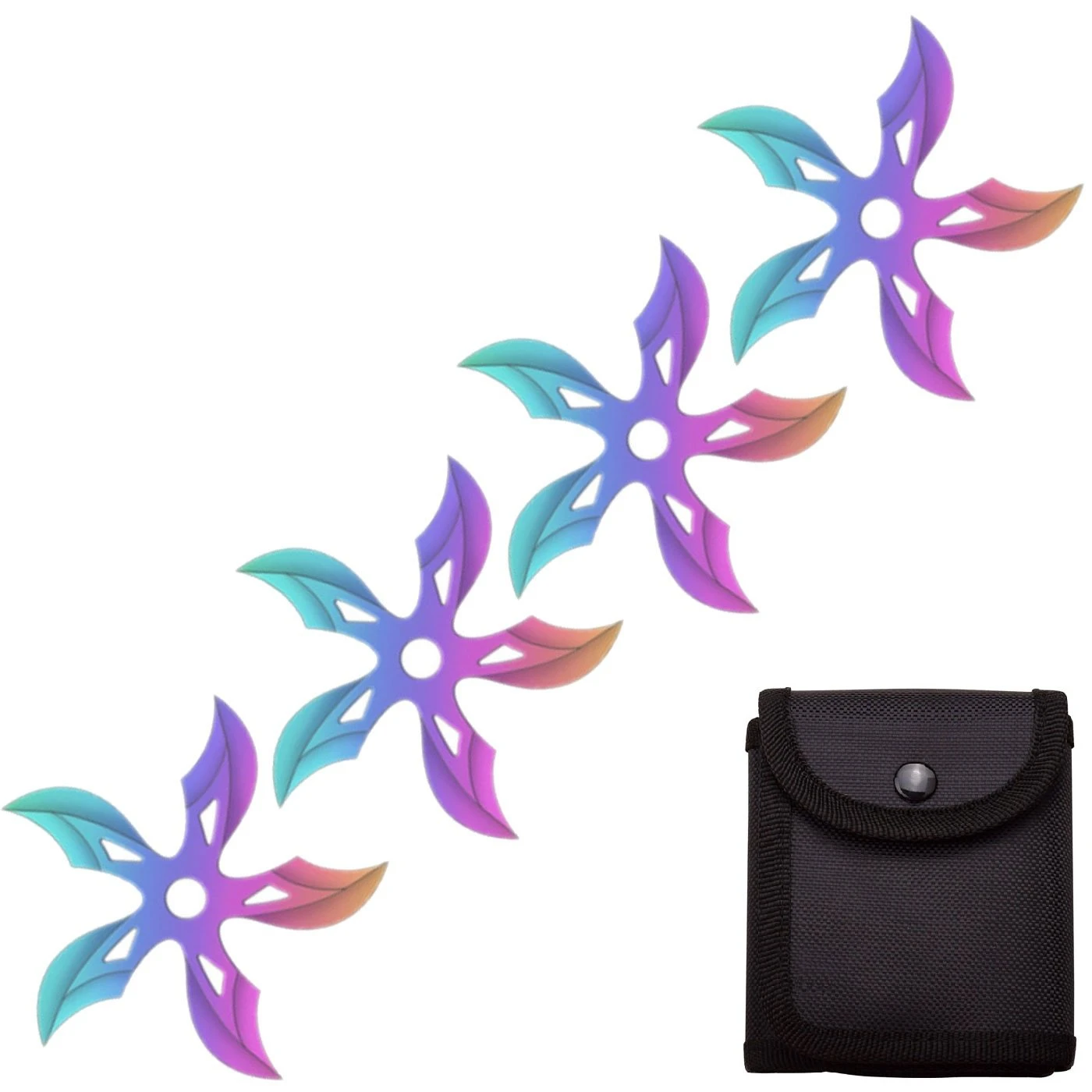 The incredible five sided curve blades titanium rainbow finish Anime throwing star is made from heavy, high grade stainless steel. This ninja stars are forged and sharpened to have greater mass and supreme balance. This allows the five point shiruken to stick to targets in a deadlier fashion than smaller or lighter throwing stars.