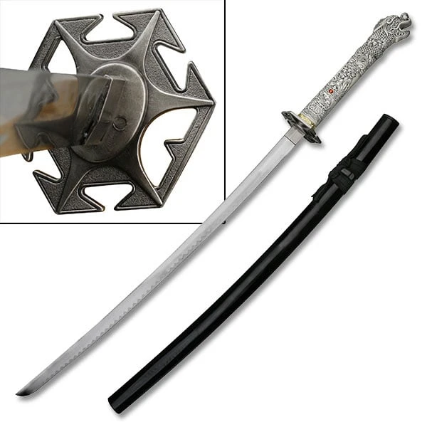 41 Inch Overall Length Highlander 3rd Generation Dragon Sword. 26 Inch Carbon Steel Blade. 12 Inch Handle with Dragon Design. Includes Black Scabbard