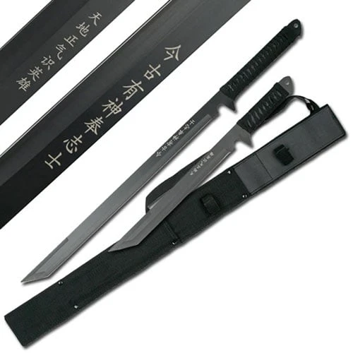 18 Inch and 26 Inch Overall Length Ninja Swords. Black Stainless Steel Blades with Cord Wrapped Handle. Includes 2 in 1 Nylon Sheath & Shoulder Strap
