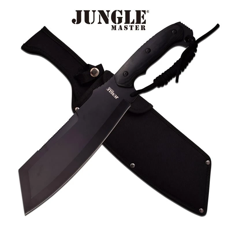 Jungle Master Fixed Blade Outdoor Machete Knife. 15.75 Inch Overall Length. 10 Inch Stainless Steel Blade. Black Pakka Wood Handle with Black Lanyard. Includes Nylon Sheath