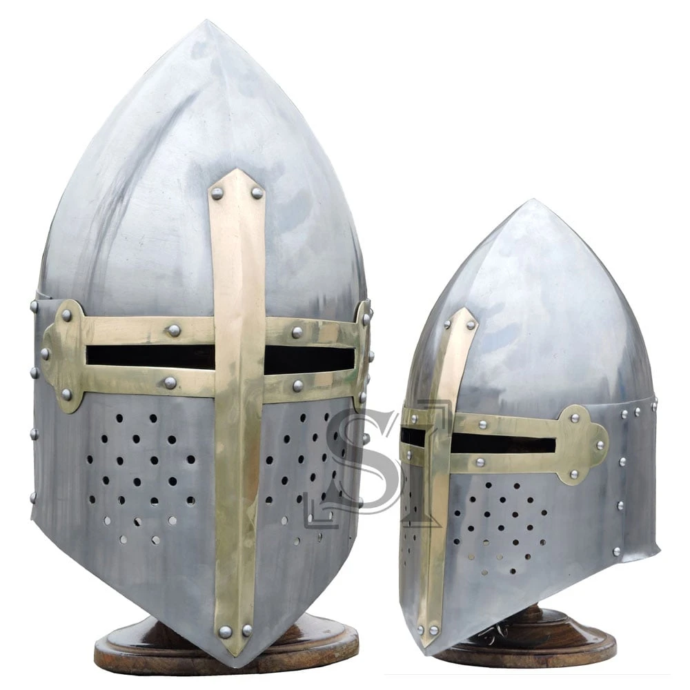 Sugarloaf helmet is variation of top helm with sphero-conical dome. It was popular in Europe in the first part of XIV century. This helm is made from 16g steel with real brass accents. The lower portion of the helmet consists of two parts that are riveted to the dome. The brass accents form a cross that attaches to the front with eye slits. The front features several holes for ventilation. Inside a leather suspension liner is provided for comfort and includes an adjustable chin strap with steel buckle. A steel loop is also provided to hold the extra leather tight from the adjustable chin strap. The sugarloaf helmet is easy-to-use and provides with perfect protection during medieval fencing. Comes with the wooden display stand.