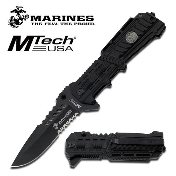 5 Inch Closed Length Mtech USA Marines Spring Assisted Knife. 3.5MM Thick Half Serrated Stainless Steel Blade. Black Rifle Design Plastic Handle. Includes Breaker and Pocket Clip