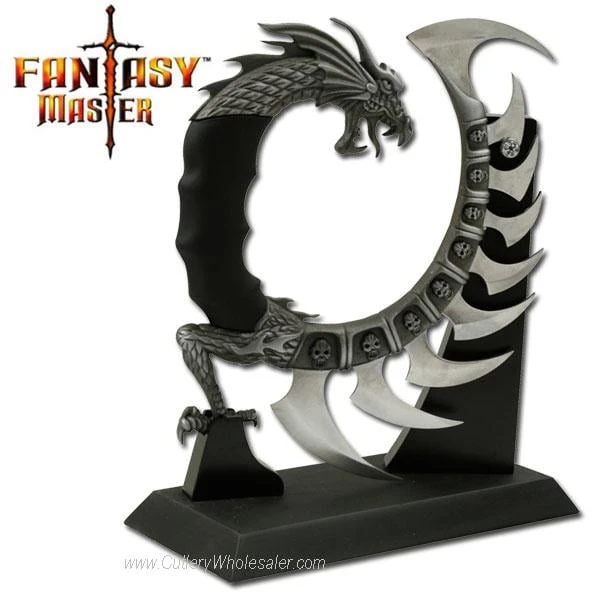 Is 8″ overall with 9 stainless steel blades. Includes wooden display stand.