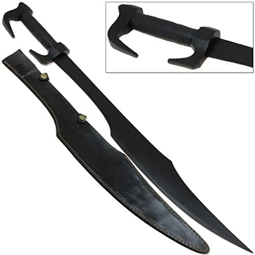 Iconic in blade profile and hand guard pattern, this Spartan sword is similar to Greek and Roman designs. All stainless steel with metal hand guard and satin black finish. Full sized each piece is handmade and may contain slight variation. Comes with the leather sheath with belt loop.